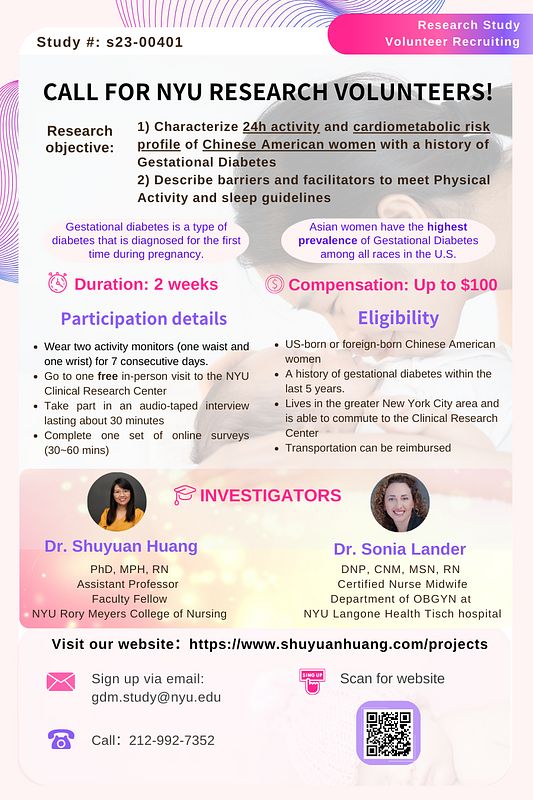 Introduction: This is a nursing research study to characterize the 24-hour activity and cardiometabolic risk profile for Chinese American women with a history of gestational diabetes [GD]. The purpose of this mixed method study is to describe the multi-contextual barriers and facilitators to meet current physical activity and sleep guidelines for the targeted population. Gestational diabetes is a type of diabetes that is diagnosed for the first time during pregnancy. Your cardiometabolic risk profile includes your blood sugar level, blood cholesterol or triglyceride levels, blood pressure, body fat percentage, and so on, together they influence your risk of heart disease, stroke, and diabetes.