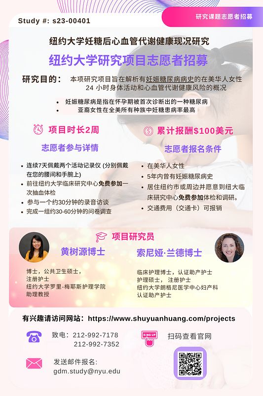 • 发送电子邮件至 gdm.study@nyu.edu 报名参与妊娠糖尿病研究。